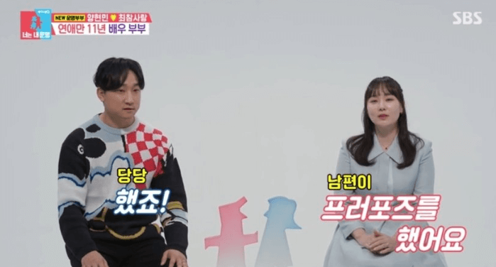 이날 방송에서는 양현민 최참사랑 부부의 러브스토리가 공개됐다. 두 사람은 무려 11년간의 연애 끝에 결혼에 골인한 사연을 털어놓으며 시청자들의 관심을 끌었다. 아내 최참사랑은 프러포즈 당시를 떠올리며 기대와는 다른 현실적인 상황을 폭로했다.