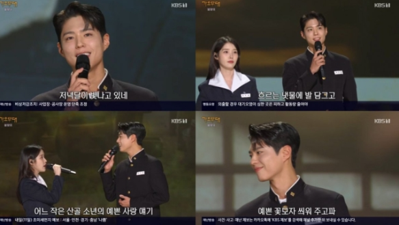 지난 10일 방송된 KBS1 ‘가요무대’에서 박보검과 아이유는 1970년대 감성을 물씬 풍기는 예민의 ‘산골 소년의 사랑 이야기’를 함께 불렀다. 두 사람은 극 중 캐릭터를 연상시키는 교복 차림으로 무대에 등장해 한 편의 드라마 같은 분위기를 연출했다.